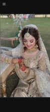 A soft organza dupatta adorned with gold bindi motifs and elegant 4-sided kiran lace completes this stunning 3PC look. Adds just the right amount of sparkle to your Nikah day dress.