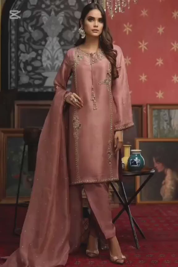 3PC Ready-to-Wear Embroidered Raw Silk Suit – Pink