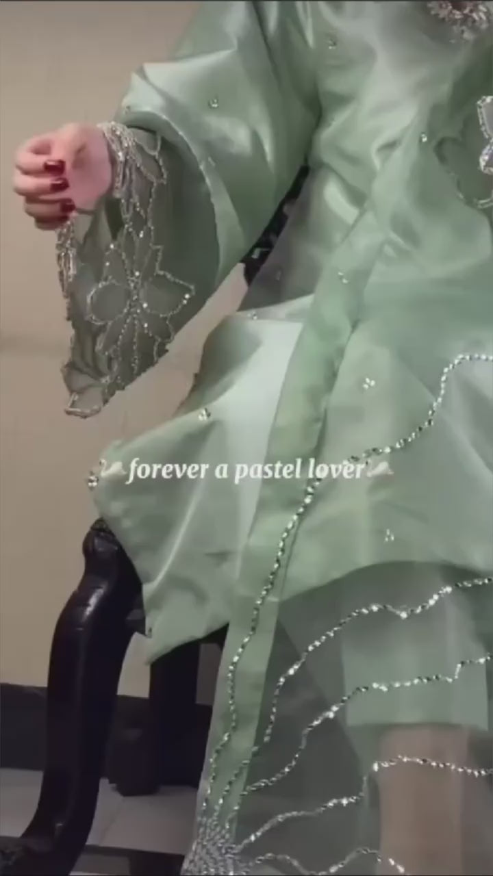 This stitched 3-piece dress in a soft frosty color shalmoz stuf features a uniquely styled front neckline with three rounded panels, embellished with elegant white crystal stones and delicate motif detailing. The shirt's front is fully adorned, while the sleeves are enhanced with crystal lace on tissue fabric. Paired with a matching capri same as shirt stuf and an organza dupatta 4 sided plta decorated with shirt-style finishing and white crystal stone work on both side pallus, this outfit is a perfect blend of sophistication and subtle glam.