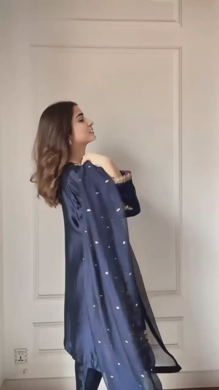 Elevate your elegance with this dark blue 3-piece embroidered shalwar kameez, crafted from premium Shisha Silk fabric that delivers a graceful fall and soft sheen. The outfit showcases golden kora, dabka, gota, pearls, chains, and sitara detailing, giving it a rich and luxurious look.