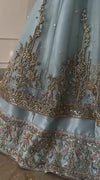 The pastel blue organza dupatta is finished with a heavy embroidered border and scalloped lace, with scattered sequins and floral motifs, adding a soft sparkle and completing the bridal look.