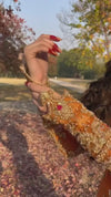 is a bright orange net shirt and dupatta paired with Raw Silk Farshi sharara is heavily embellished with zari, dabka, the sequence with a hint of shocking pink and olive Green Resham.